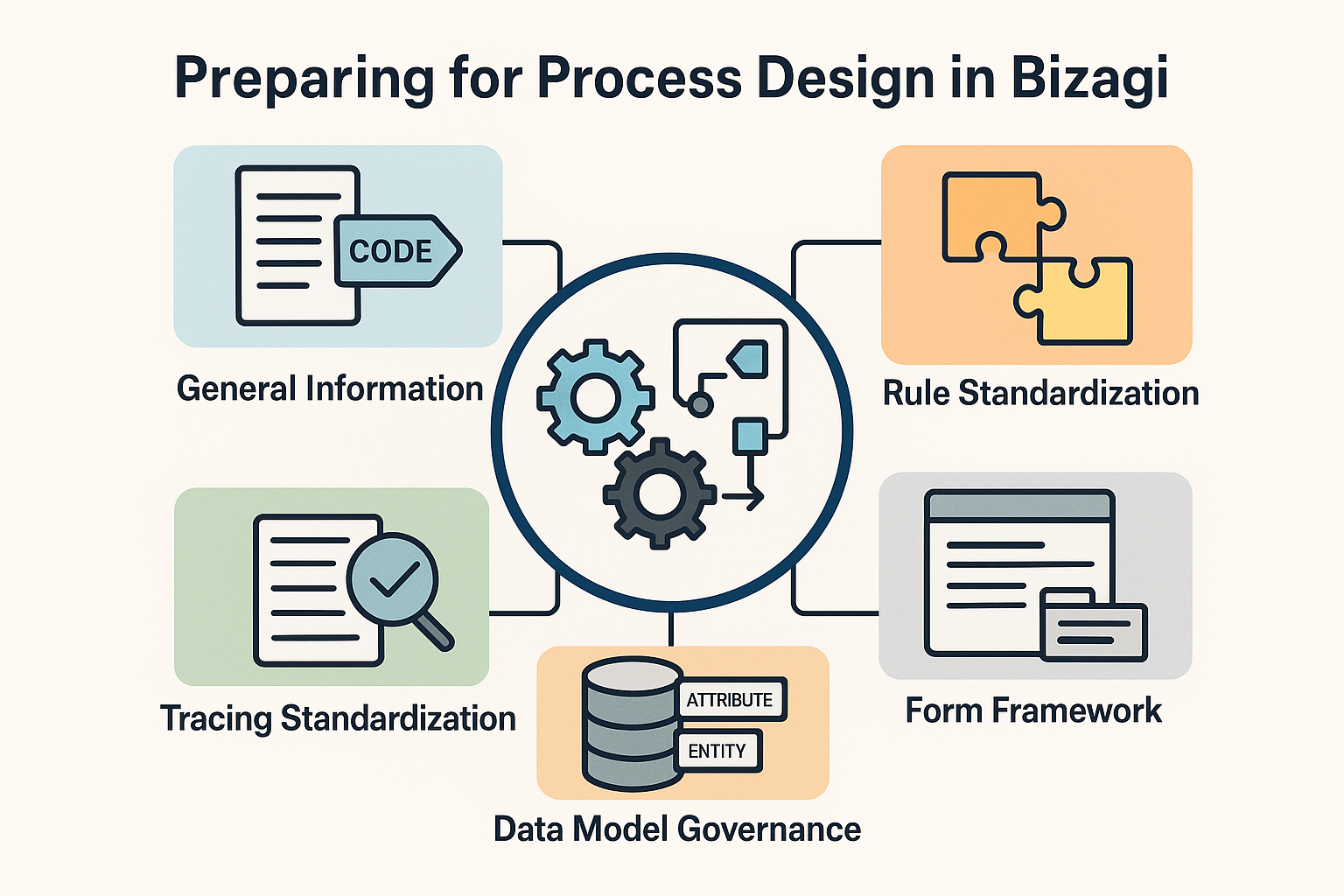 There are a few things you need to do before you actually create your process in Bizagi. Because Bizagi remembers everything and changing / deleting processes is not the best course of action, it is best if you have a clear idea of what you need: